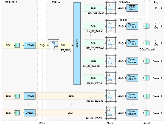 DTA-2110提供了一个新的软件接口。"音频/视频FIFO "API(AvFifo),特别适用于处理基于组件的SMPTE 2110流。AvFifo是DTAPI的一部分,以确保与其他DekTec PCIe卡和USB模块兼容。与Matrix API同步的多组件(基于服务)处理将在以后阶段得到支持。