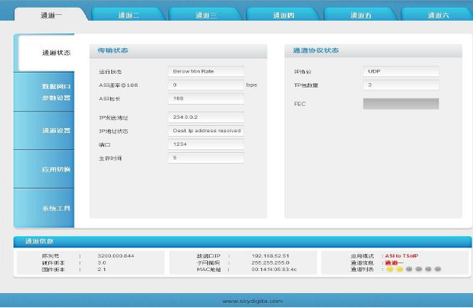 支持6路 ASI to TSoIP 或 TSoIP to ASI;支持 UDP, RTP, 2D FEC (SMPTE-2022);Web界面控制
