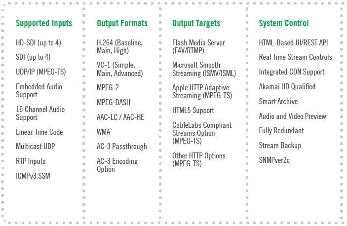 同时从一个单一的系统 - 无需多台设备或信号分离设备,通过Adobe,Apple,MPEG-DASH和Microsoft的流媒体协议,支持实时自适应比特率播放,从而降低了成本和复杂性。