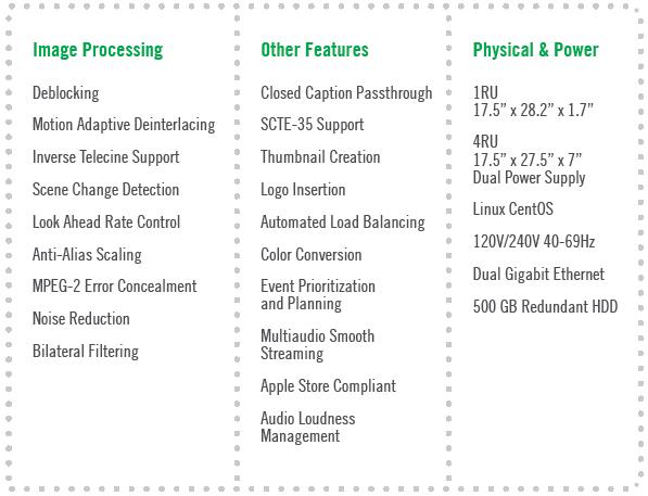 提供体积更小的自适应比特率流,更低的功耗。支持多个输入和同时输出多个HD和SD编码,6个1080p,12个720p或16个480p流媒体同时进行编码,基于GPU视频处理的算法支持各种各样灵活的输出