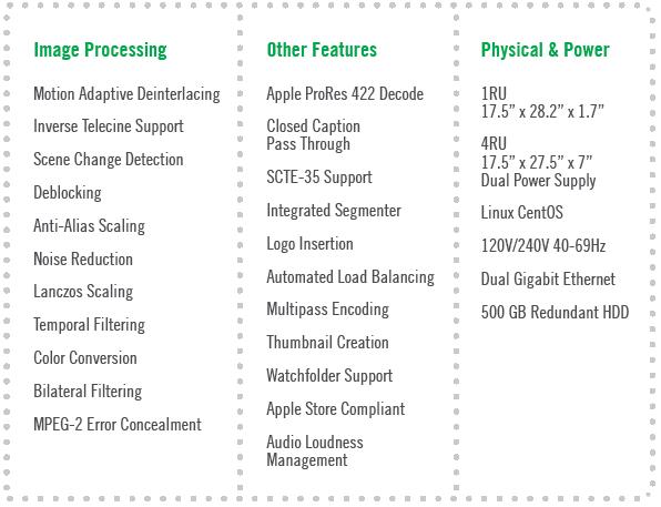 使用定制的编解码器包括ProRes,H.264,MPEDG-2和VC-1提供最高质量的编码质量。计算密集型视频处理等功能使运动画面自适应去隔行,运用最新的并行结构处理,使MPEG-2数据块和时间帧速率转换更优化。