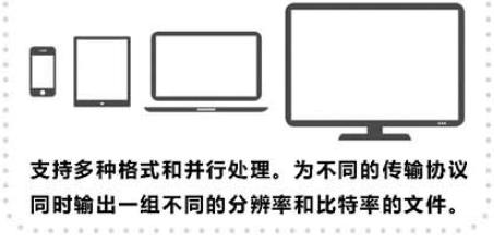 针对不同的播放器和平台创建多种分辨率,比特率和输出格式。包括支持自适应流等,例如:Microsoft Silverlight,Adobe Flash和Apple设备。文件封装包装目前流行的F4V,3GP,ASF/WMV,MP4和MPEG-2。