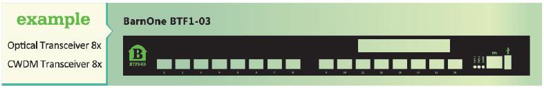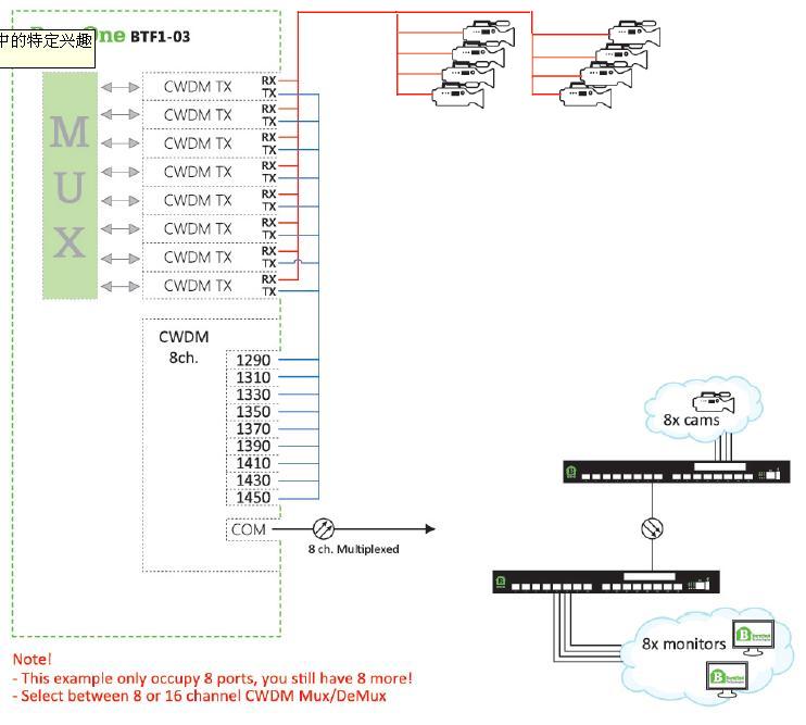 This example shows a typical surveillance application. The cameras are using fiber to transmit, but coaxial is possible either by changing SFP modules or by using BarnOne BTF1-07.